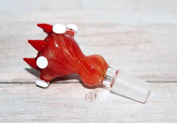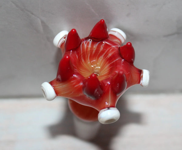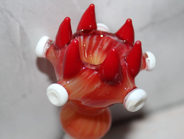 This ad features (1) one 14 mm FLAMING SABER TOOTH Glass slide bowl that features 6 red saber teeth, a marble-like glass body finish, a 5 pointed star-like body with white disc points and a tapered body as shown. This extreme art glass piece is very unique and would be a great addition to your collection.