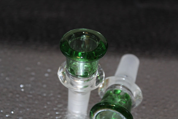 This ad is for 1 (one) 14.4mm GREEN glass shot glass shaped water pipe slide bowl head piece with a clear glass doughnut grip and lower slide joint. Over-all this slide bowl is about 2 1/2" long and has a 14.4 mm male joint size. The actual bowl part of the slide is a 3/4" diameter (at top) x 3/4" deep cone shape with a flat bottom and a permanent snowflake type glass screen at the bottom. The grip is 1 1/4" in diameter and 3/16" thick.