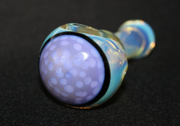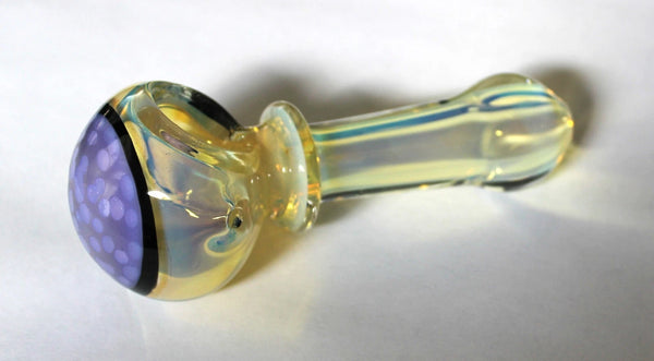 This ad features a 4 1/2" PURPLE MOON glass smoking pipe with a purple textured head and black band, a gripping ring and a super fumed inside finish. This pipe is great looking, robust, a great joy to smoke and a good addition to your collection.