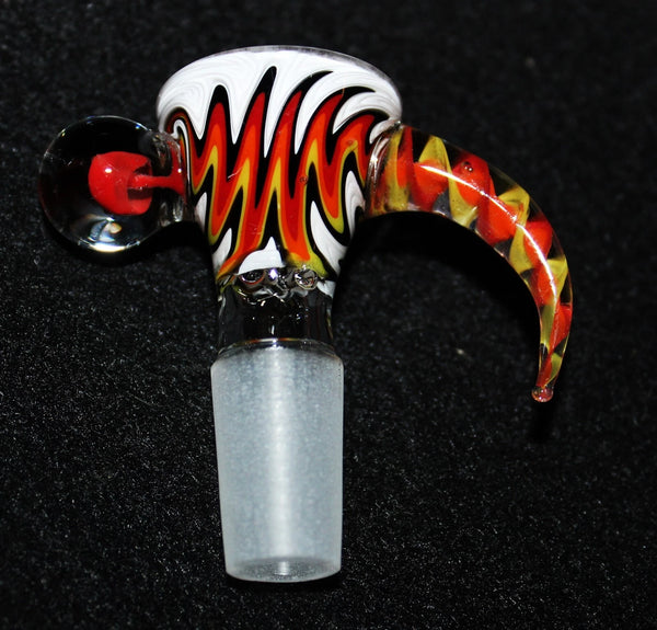 This ad is for ONE (1) 14mm SUNSET WAVE glass water pipe slide bowl with a horn and ball and a built-in cross-bar screen. The horn is clear glass with a tri-color accent ribbon twisted inside and the ball is clear glass with colored mushroom inside to match.