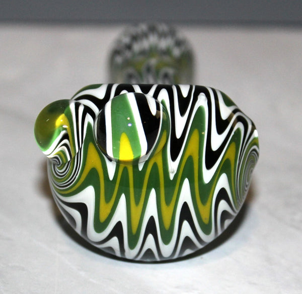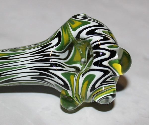 This ad features a 5" RIPPLE GLASS glass tobacco smoking pipe made from high quality borosilicate glass. This piece features a smooth glass finish, a built-in snowflake type glass screen, 3 stabilizing beads and a left side air control hole. The unique swirl coloring and design is sure to be a hit!